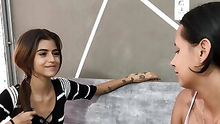 My stepsister arrives tired and wanting a tastey rubdown so I give it to her and we end up having lesbian hook-up