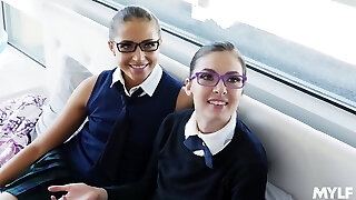 Girly-girl strippers in stockings get naught as they start kissing and ramming their cunts with their sex toys