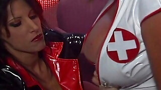 Monster strapon, cunt and anal fisting and a bunch of lesbian ejaculations with a authoritative MILF in stockings